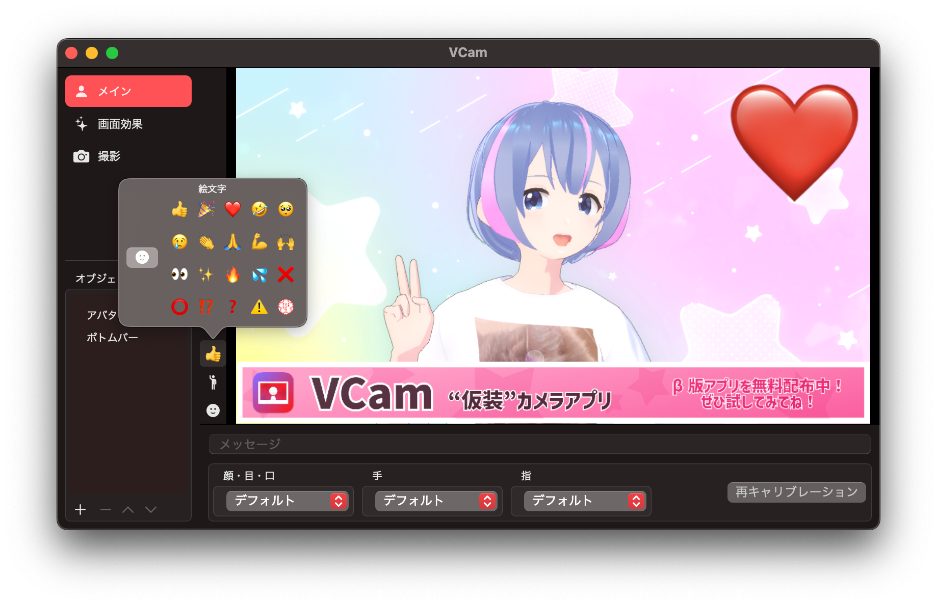 VCamはmacOSで簡単にアバターになれるアプリです。OBS Studioと連携して配信に使えるのはもちろん、ZoomやGoogle MeetなどのWeb会議アプリと直接連携して好きな姿で自分を表現できます。